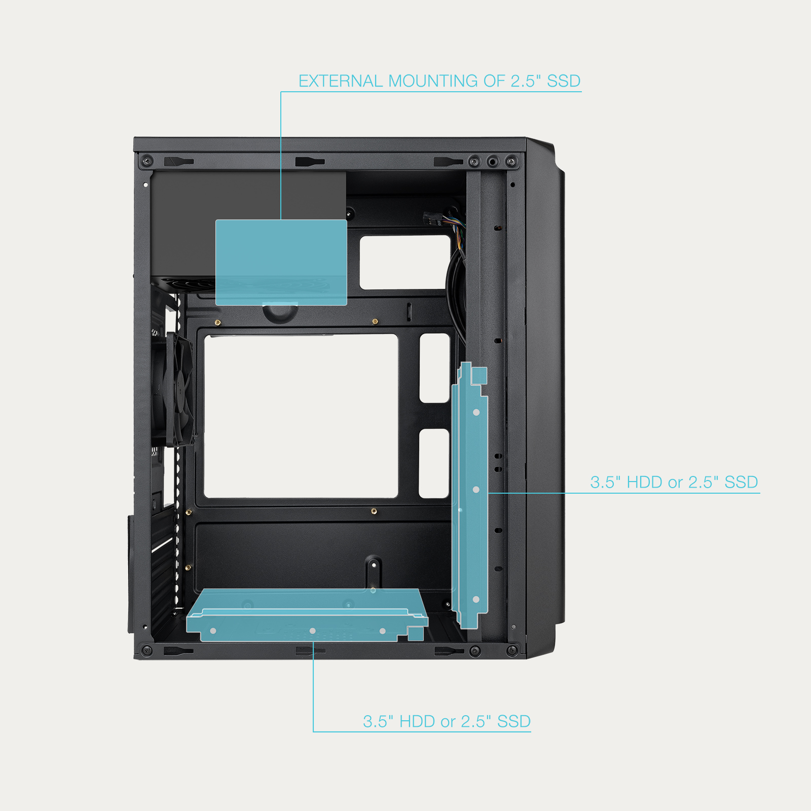 Bahías int.: 2×3,5", 3×2,5" / USB3.0 + USB2.0 + USBC / Audio HD / MiniTorre con fuente ATX 500W incluida.