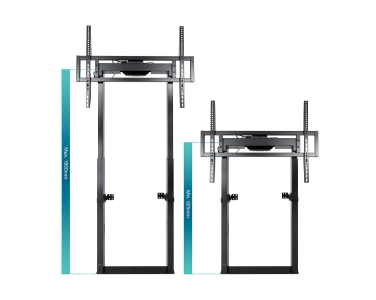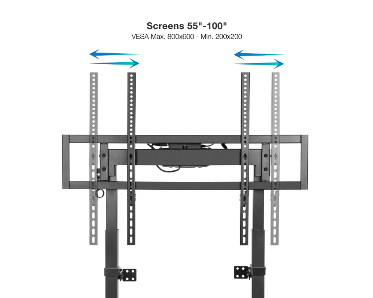 De 55 a 100"/ VESA máximo 800x600mm/ Hasta 120kg/ Altura ajustable de 925 a 1600mm/ Regulación eléctrica de altura