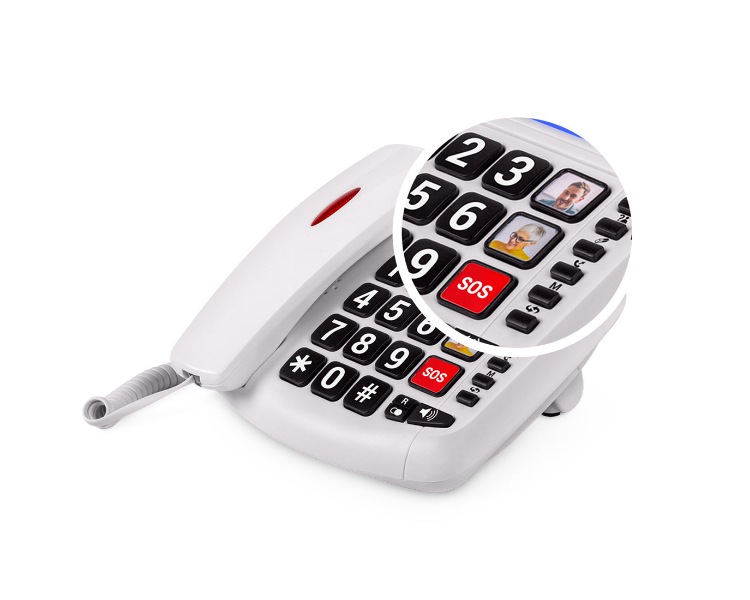 Los botones grandes y números de gran contraste facilitan que la persona mayor pueda verlos, pulsarlos y llamar sin complicaciones.